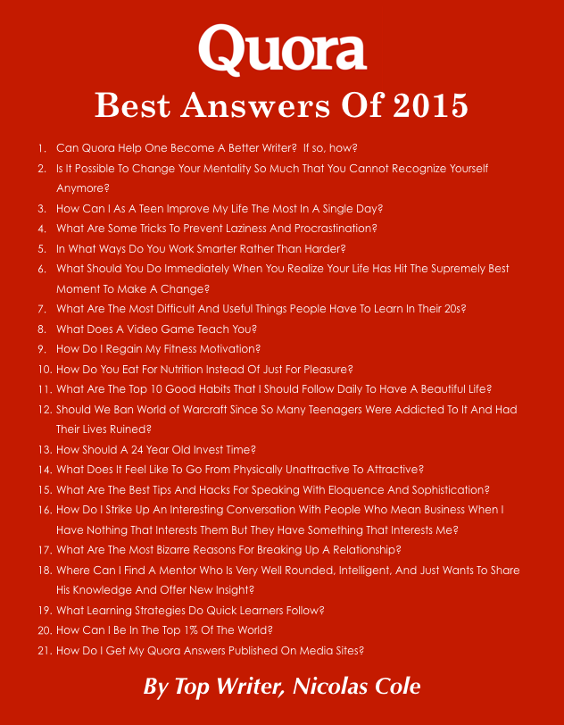 And now, a year later, I sit here sharing this with you: my first (of hopefully many) Best Answers Of the past year. Out of the hundreds of answers I have written, these are my favorites. A few of them accumulated hundreds of thousands of views and became popular staples on the site, but most are answers I chose simply because I felt they expressed something very revealing about me as a writer and provide true value.